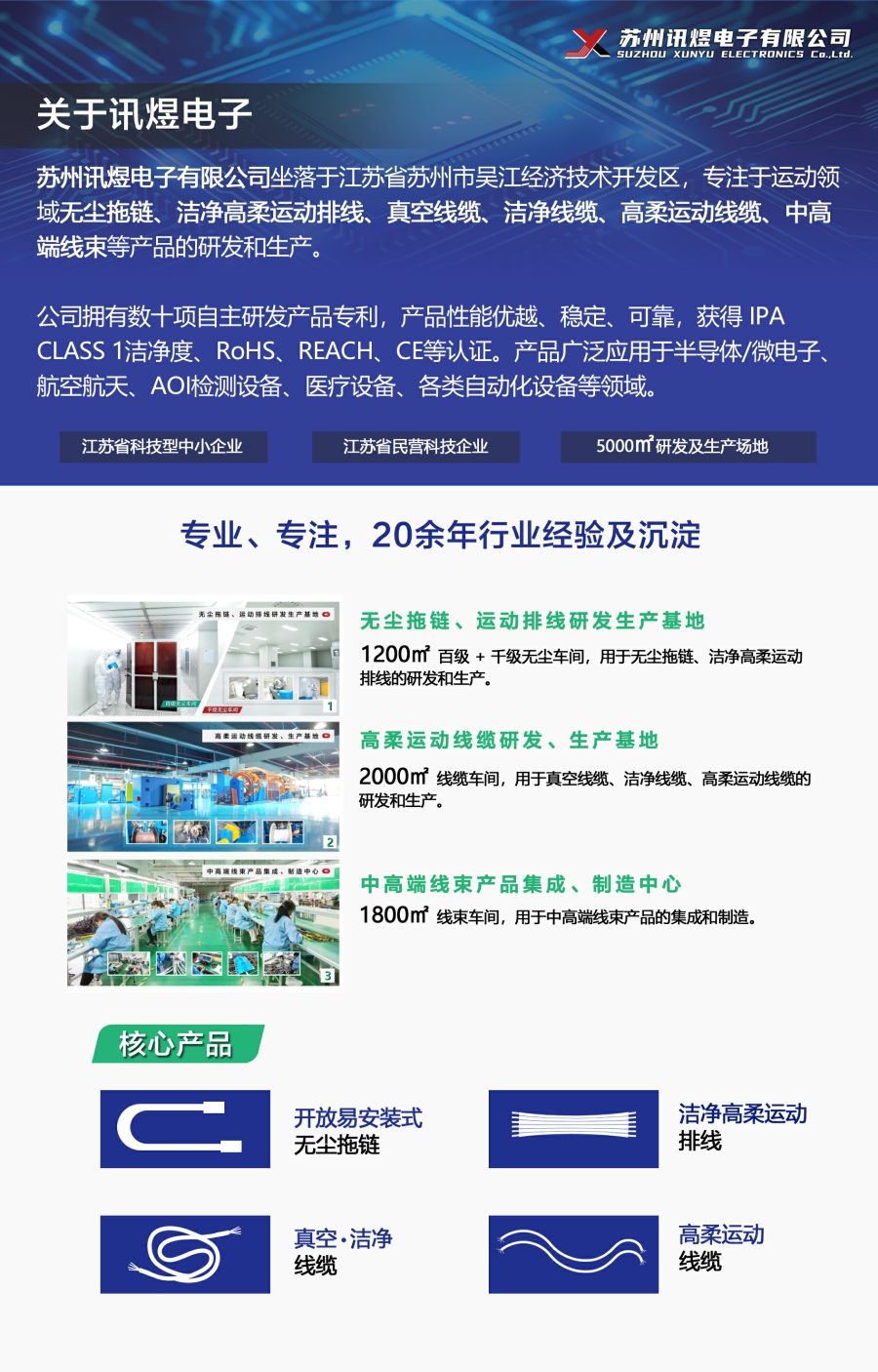 經過20多年的沉淀與發展,目前訊煜電子已經發展成為一家集無塵拖鏈、潔凈高柔運動排線、真空線纜、潔凈線纜、高柔運動線纜、中高端線束等產品的研發、生產、集成為一體的高科技企業。