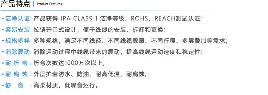 訊煜開放易安裝式無塵拖鏈是一種滿足無塵環境下線纜防護及運動需求的產品,易安裝式優于封閉式拖鏈結構,外層護套采用拉鏈開口式結構,便于線纜的安裝和更換。中間線纜由柔性線卡分隔和固定,提高線纜排布的速度和美觀度,同時減少線纜絕緣層的磨損,延長線纜的使用壽命。支持多層疊加,支持龍骨支撐,滿足長行程應用場景。 【拖鏈型號】:XYWC-BW-CS02-10 【線卡孔數】:2 孔 【線卡孔徑】:10mm 【折彎次數】:1000萬次以上 【潔凈等級】:IPA CLASS 1