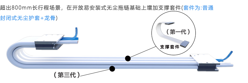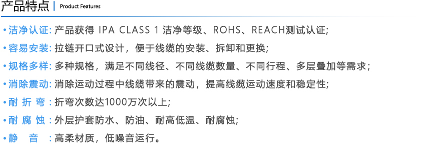 訊煜開放易安裝式無塵拖鏈是一種滿足無塵環境下線纜防護及運動需求的產品,易安裝式優于封閉式拖鏈結構,外層護套采用拉鏈開口式結構,便于線纜的安裝和更換。中間線纜由柔性線卡分隔和固定,提高線纜排布的速度和美觀度,同時減少線纜絕緣層的磨損,延長線纜的使用壽命。支持多層疊加,支持龍骨支撐,滿足長行程應用場景。 【拖鏈型號】:XYWC-BW-CS04-10 【線卡孔數】:4 孔 【線卡孔徑】:10mm 【折彎次數】:1000萬次以上 【潔凈等級】:IPA CLASS 1