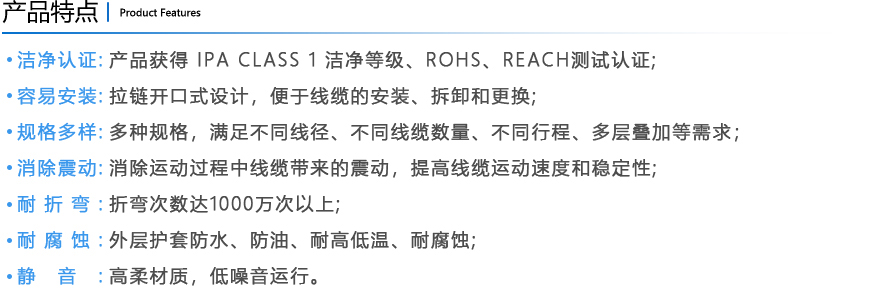 訊煜開放易安裝式無塵拖鏈是一種滿足無塵環境下線纜防護及運動需求的產品,易安裝式優于封閉式拖鏈結構,外層護套采用拉鏈開口式結構,便于線纜的安裝和更換。中間線纜由柔性線卡分隔和固定,提高線纜排布的速度和美觀度,同時減少線纜絕緣層的磨損,延長線纜的使用壽命。支持多層疊加,支持龍骨支撐,滿足長行程應用場景。 【拖鏈型號】:XYWC-BW-CS07-10 【線卡孔數】:7 孔 【線卡孔徑】:10mm 【折彎次數】:1000萬次以上 【潔凈等級】:IPA CLASS 1